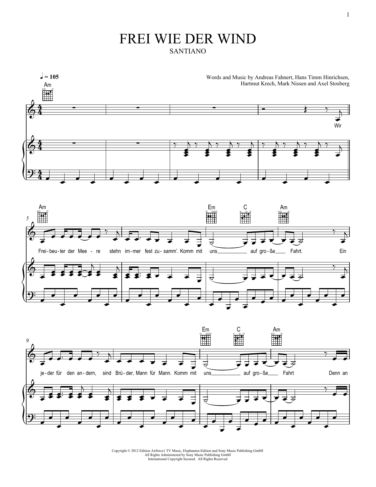 Download or print Santiano Frei wie der Wind sheet music, chords and digital score arranged for Piano, Vocal & Guitar Chords (Right-Hand Melody). This German score includes 6 page(s).