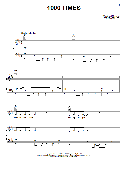 Download or print Sara Bareilles 1000 Times sheet music, chords and digital score arranged for Piano, Vocal & Guitar Chords (Right-Hand Melody). This Pop score includes 8 page(s).