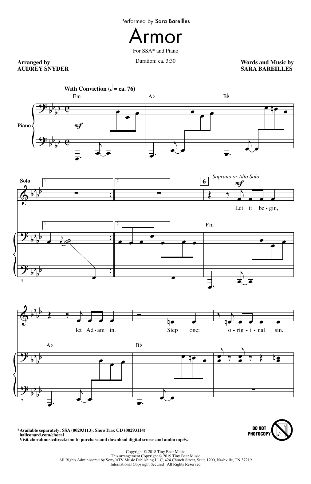 Download or print Sara Bareilles Armor (arr. Audrey Snyder) sheet music, chords and digital score arranged for SSA Choir. This Pop score includes 14 page(s).