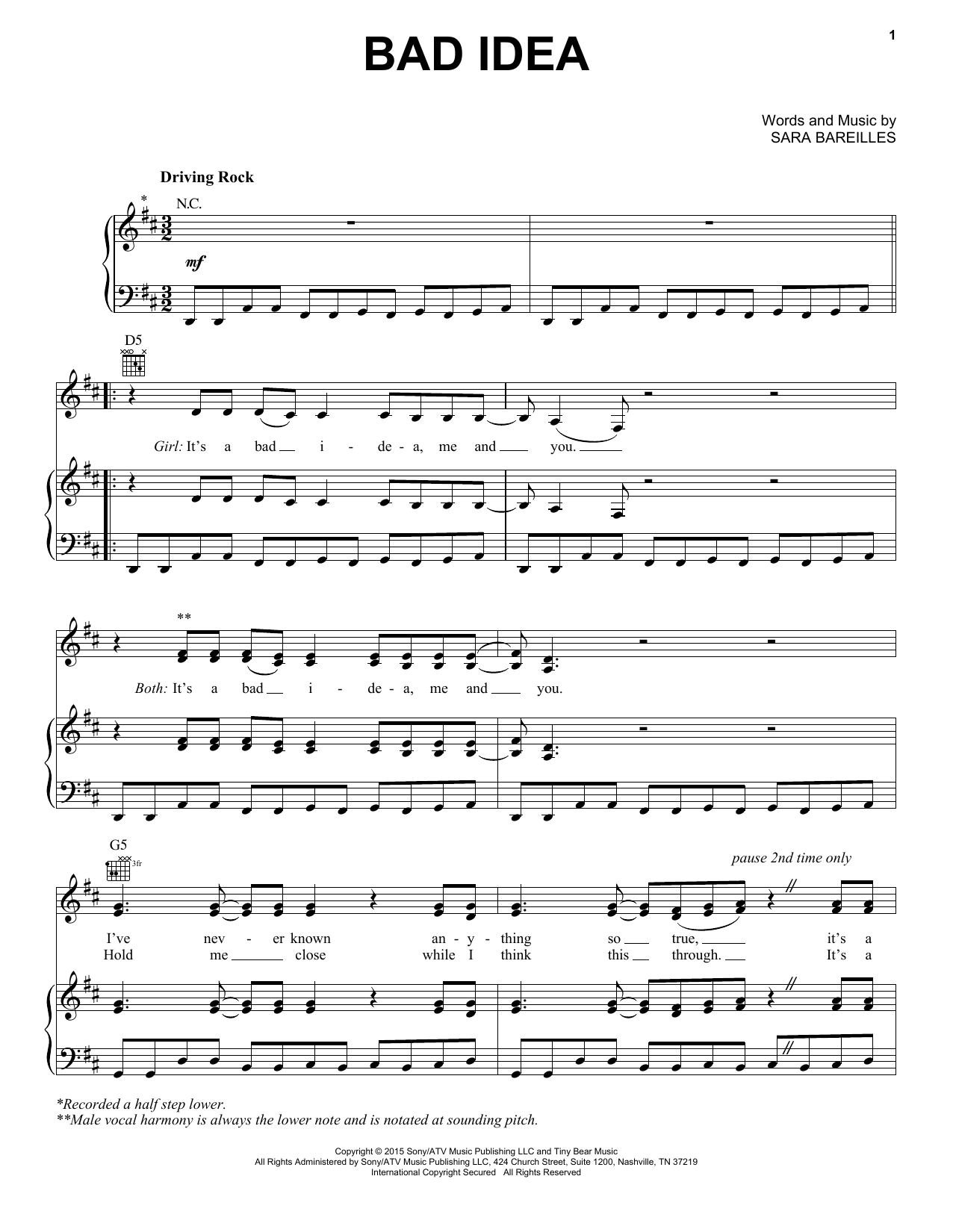 Download or print Sara Bareilles Bad Idea (from Waitress The Musical) sheet music, chords and digital score arranged for Piano, Vocal & Guitar Chords (Right-Hand Melody). This Pop score includes 9 page(s).