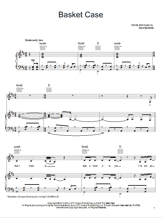 Download or print Sara Bareilles Basket Case sheet music, chords and digital score arranged for Piano, Vocal & Guitar Chords (Right-Hand Melody). This Pop score includes 6 page(s).