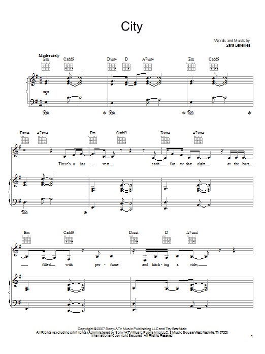 Download or print Sara Bareilles City sheet music, chords and digital score arranged for Piano, Vocal & Guitar Chords (Right-Hand Melody). This Pop score includes 9 page(s).