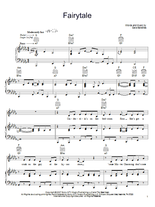 Download or print Sara Bareilles Fairytale sheet music, chords and digital score arranged for Guitar Chords/Lyrics. This Rock score includes 4 page(s).