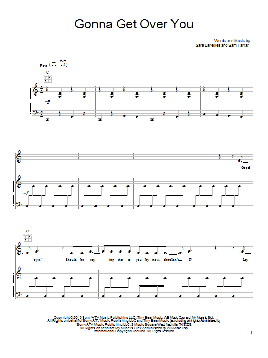 Download or print Sara Bareilles Gonna Get Over You sheet music, chords and digital score arranged for Big Note Piano. This Rock score includes 7 page(s).