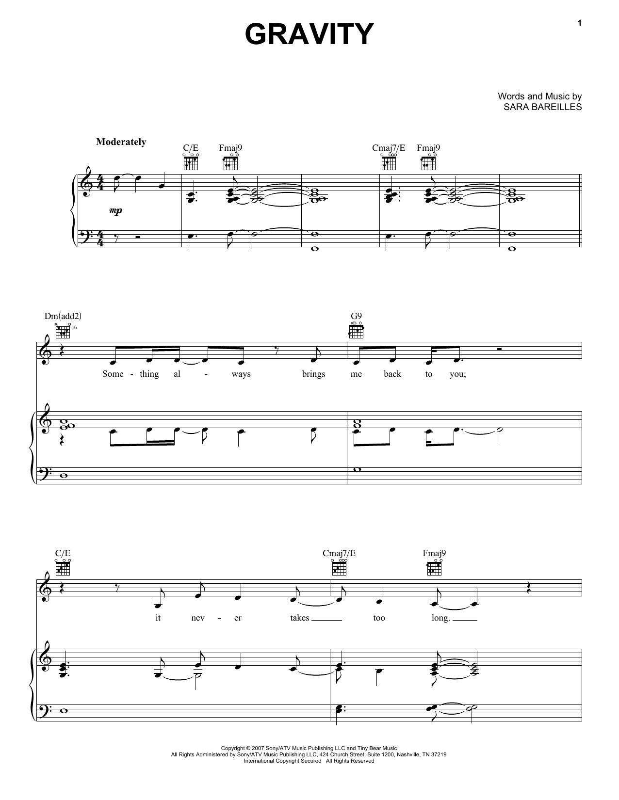Download or print Sara Bareilles Gravity sheet music, chords and digital score arranged for Piano, Vocal & Guitar Chords (Right-Hand Melody). This Pop score includes 8 page(s).