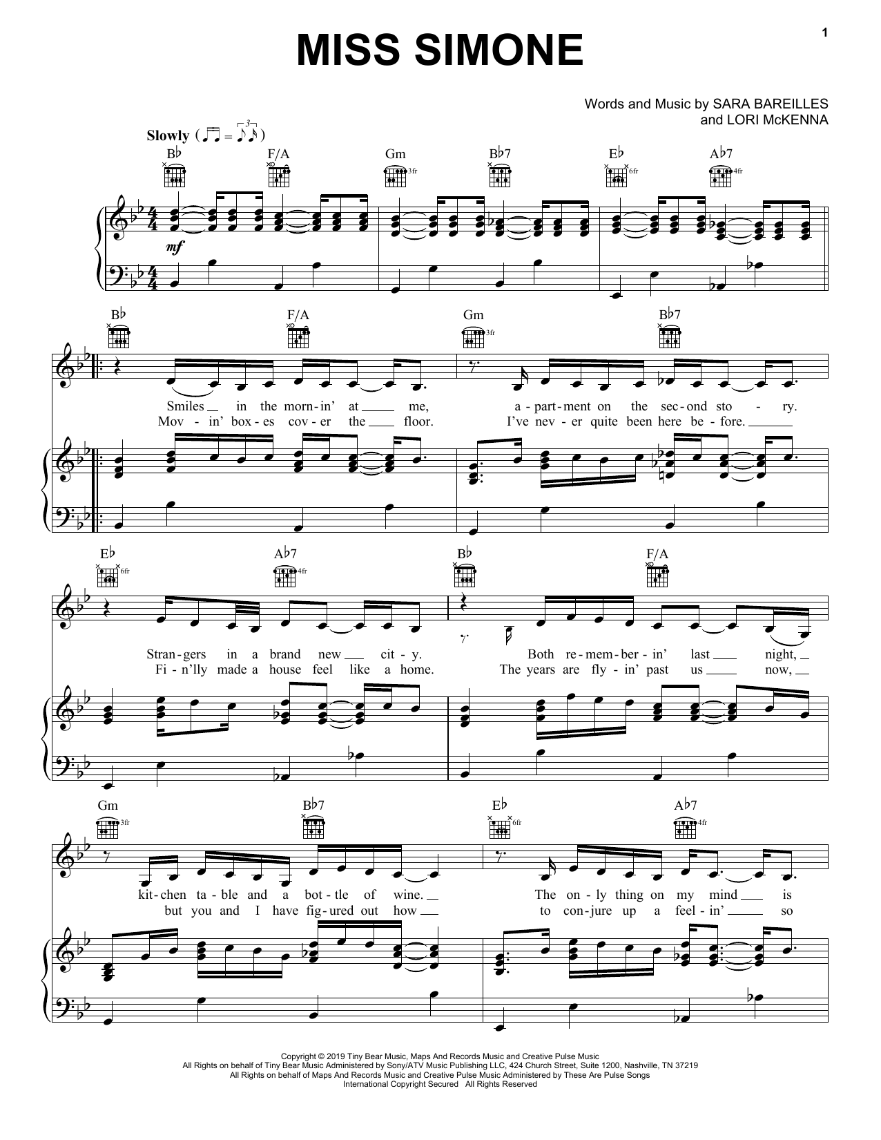 Download or print Sara Bareilles Miss Simone sheet music, chords and digital score arranged for Piano, Vocal & Guitar Chords (Right-Hand Melody). This Pop score includes 4 page(s).