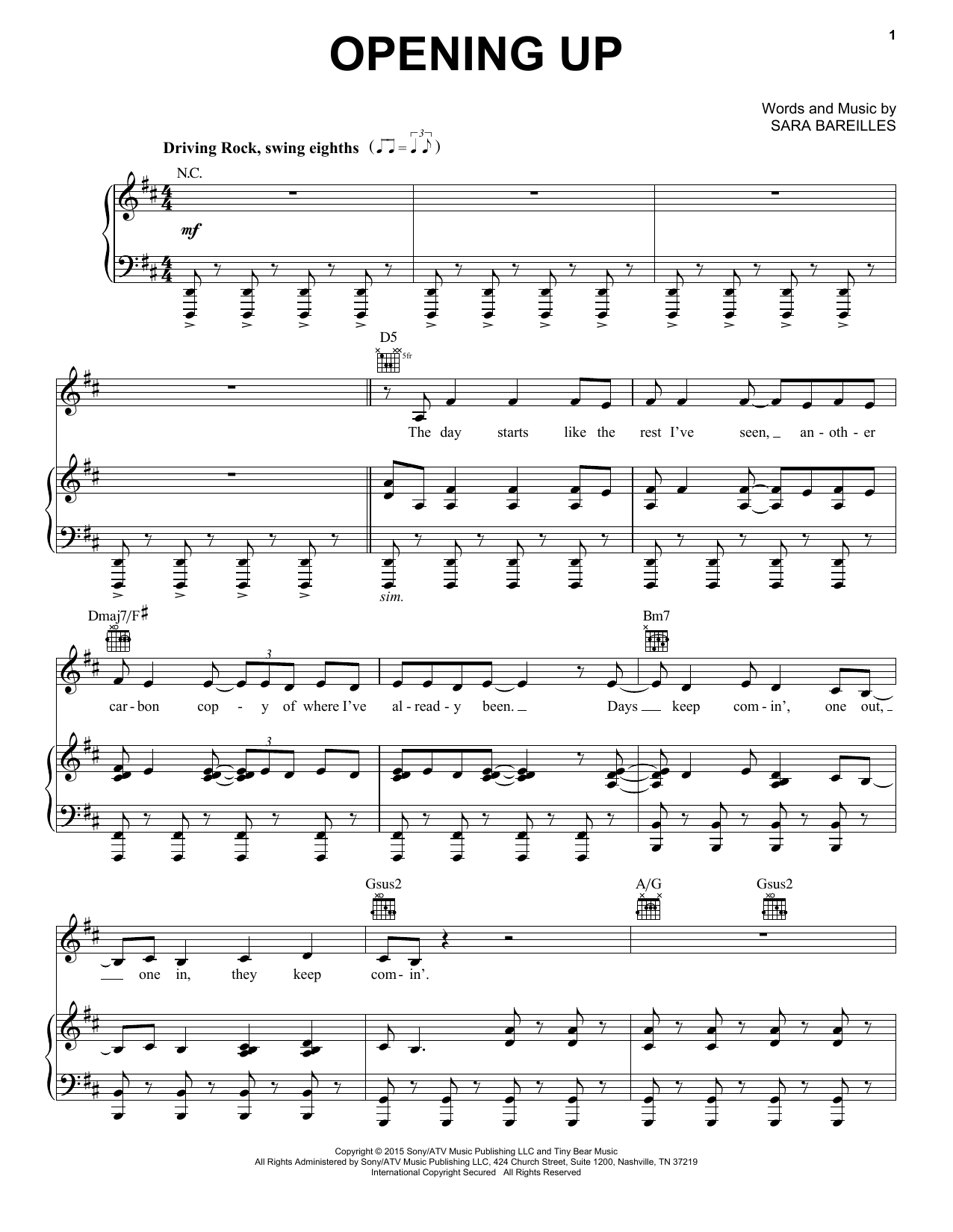 Download or print Sara Bareilles Opening Up (from Waitress The Musical) sheet music, chords and digital score arranged for Piano, Vocal & Guitar Chords (Right-Hand Melody). This Musical/Show score includes 10 page(s).