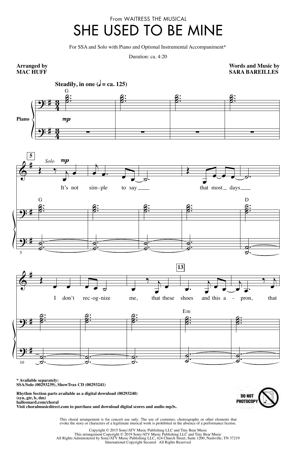 Download or print Sara Bareilles She Used To Be Mine (from Waitress the Musical) (arr. Mac Huff) sheet music, chords and digital score arranged for SSA Choir. This Pop score includes 14 page(s).