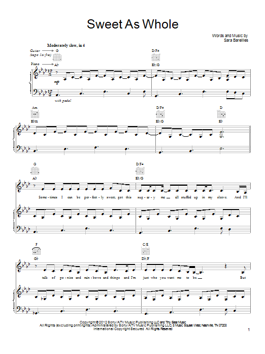 Download or print Sara Bareilles Sweet As Whole sheet music, chords and digital score arranged for Piano, Vocal & Guitar Chords (Right-Hand Melody). This Pop score includes 9 page(s).