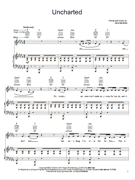 Download or print Sara Bareilles Uncharted sheet music, chords and digital score arranged for Piano, Vocal & Guitar Chords (Right-Hand Melody). This Pop score includes 7 page(s).