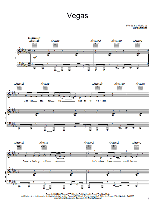 Download or print Sara Bareilles Vegas sheet music, chords and digital score arranged for Easy Piano. This Pop score includes 7 page(s).