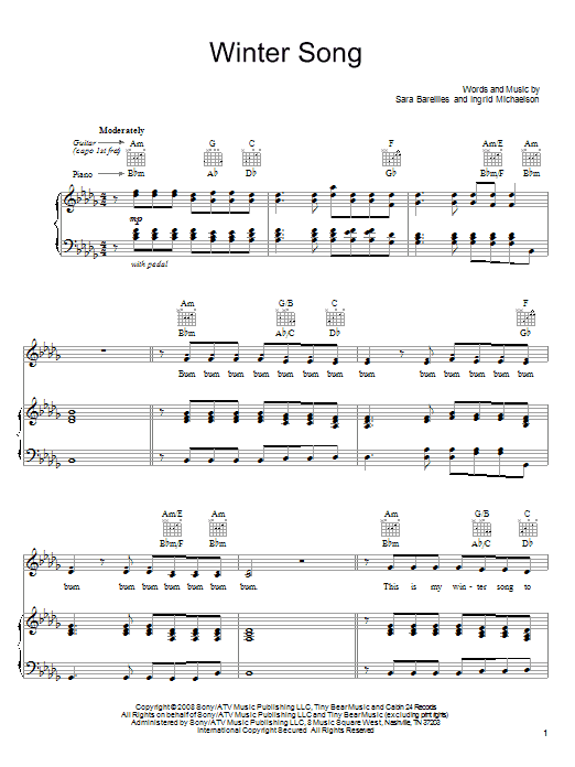 Download or print Sara Bareilles Winter Song sheet music, chords and digital score arranged for Easy Piano. This Concert score includes 6 page(s).