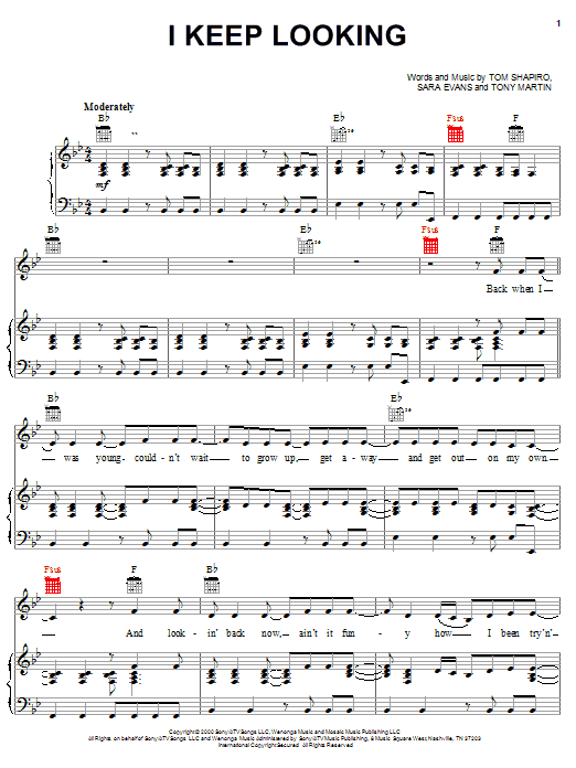 Download or print Sara Evans I Keep Looking sheet music, chords and digital score arranged for Piano, Vocal & Guitar Chords (Right-Hand Melody). This Pop score includes 6 page(s).