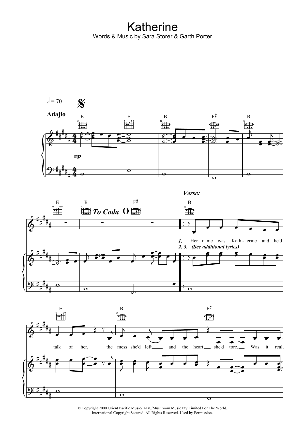 Download or print Sara Storer Katherine sheet music, chords and digital score arranged for Piano, Vocal & Guitar Chords. This Country score includes 6 page(s).