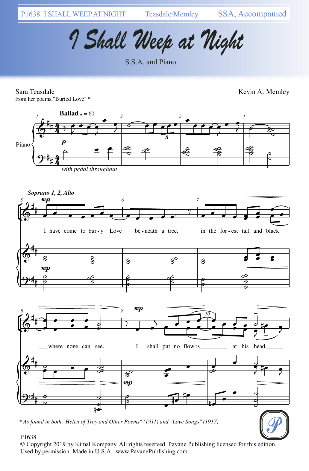 Download or print Sara Teasdale and Kevin A. Memley I Shall Weep at Night sheet music, chords and digital score arranged for SSA Choir. This Concert score includes 8 page(s).