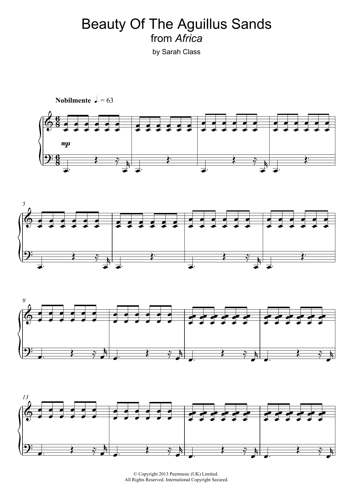 Download or print Sarah Class Beauty Of The Aguillus Sands (from 'Africa') sheet music, chords and digital score arranged for Piano Solo. This Film/TV score includes 5 page(s).