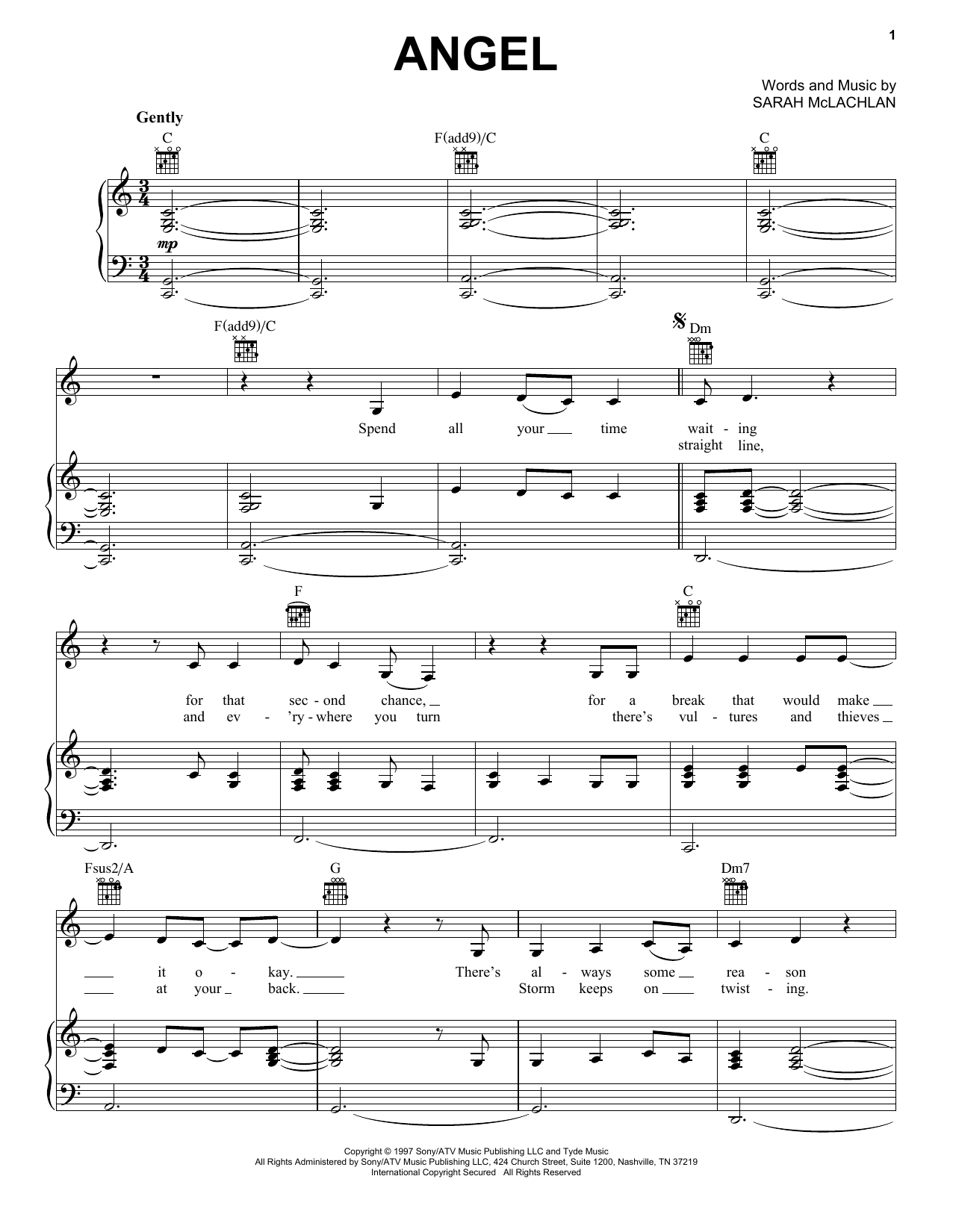 Download or print Sarah McLachlan Angel sheet music, chords and digital score arranged for Piano, Vocal & Guitar Chords (Right-Hand Melody). This Pop score includes 6 page(s).
