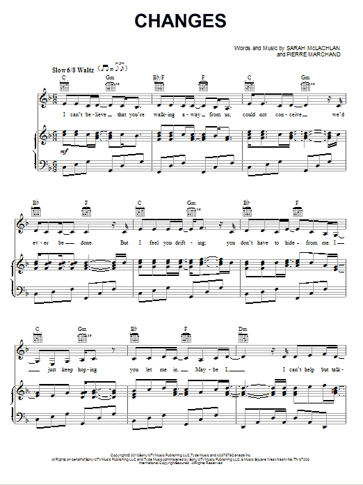 Download or print Sarah McLachlan Changes sheet music, chords and digital score arranged for Piano, Vocal & Guitar Chords (Right-Hand Melody). This Pop score includes 6 page(s).