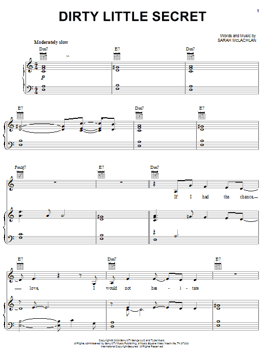 Download or print Sarah McLachlan Dirty Little Secret sheet music, chords and digital score arranged for Piano, Vocal & Guitar Chords (Right-Hand Melody). This Pop score includes 7 page(s).