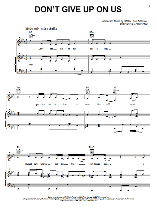Download or print Sarah McLachlan Don't Give Up On Us sheet music, chords and digital score arranged for Piano, Vocal & Guitar Chords (Right-Hand Melody). This Pop score includes 7 page(s).