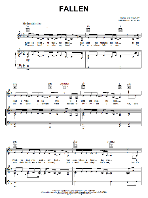 Download or print Sarah McLachlan Fallen sheet music, chords and digital score arranged for Piano Solo. This Pop score includes 5 page(s).