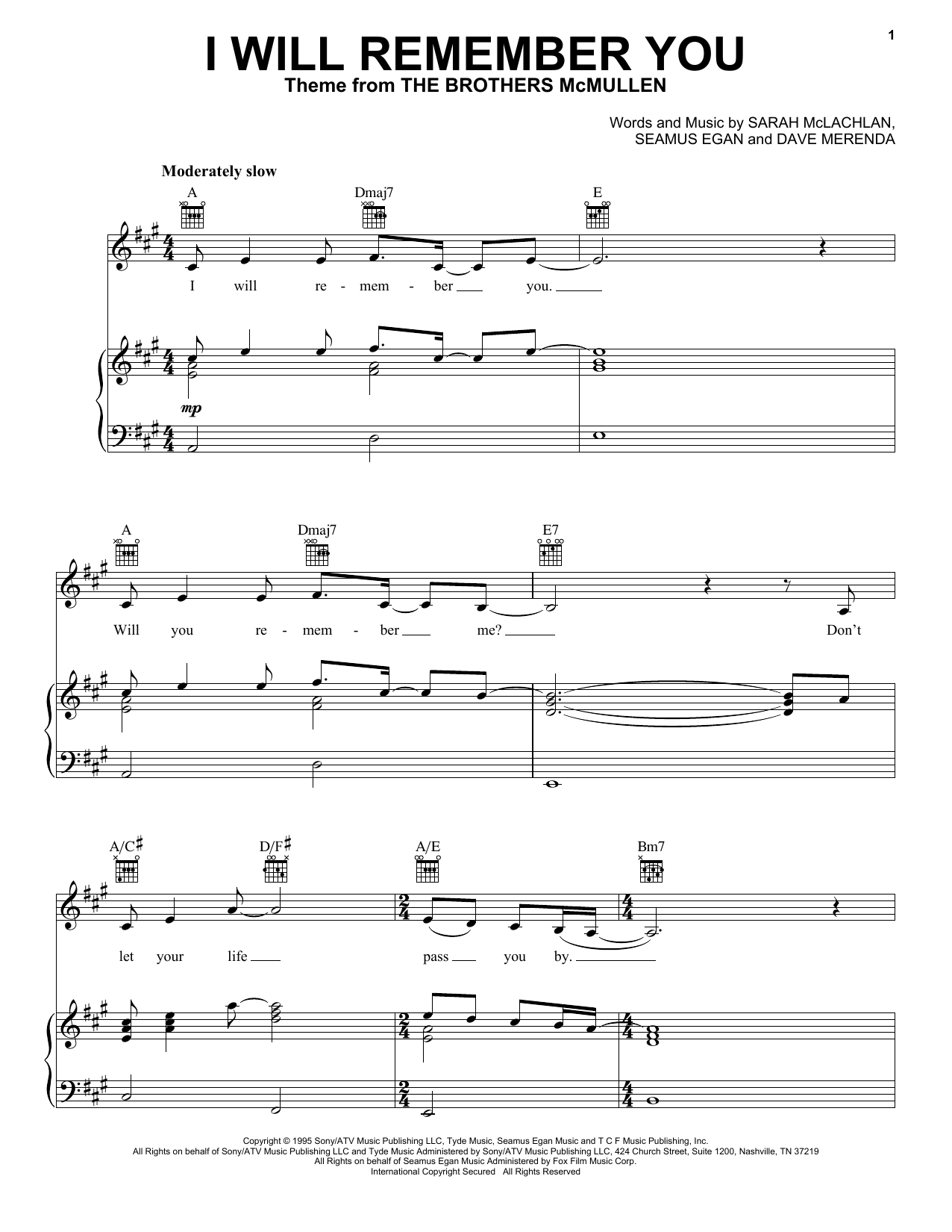 Download or print Sarah McLachlan I Will Remember You sheet music, chords and digital score arranged for Piano, Vocal & Guitar Chords (Right-Hand Melody). This Film/TV score includes 5 page(s).