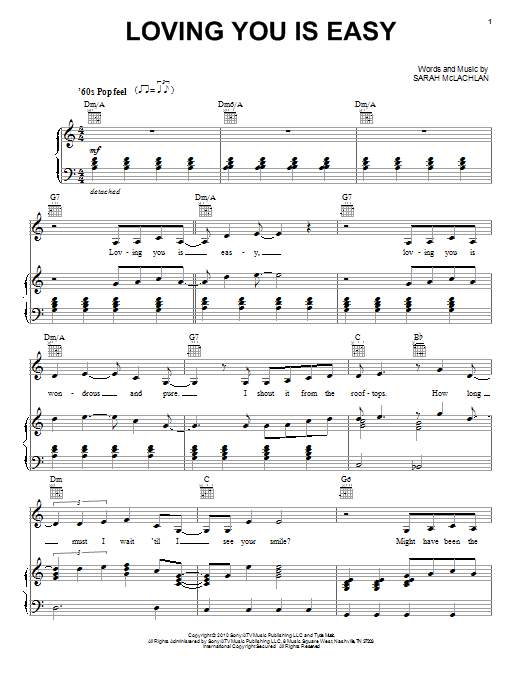 Download or print Sarah McLachlan Loving You Is Easy sheet music, chords and digital score arranged for Piano, Vocal & Guitar Chords (Right-Hand Melody). This Pop score includes 5 page(s).