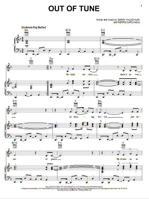 Download or print Sarah McLachlan Out Of Tune sheet music, chords and digital score arranged for Piano, Vocal & Guitar Chords (Right-Hand Melody). This Pop score includes 6 page(s).