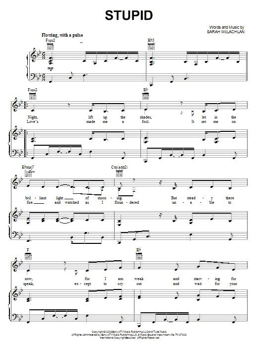 Download or print Sarah McLachlan Stupid sheet music, chords and digital score arranged for Piano, Vocal & Guitar Chords (Right-Hand Melody). This Pop score includes 5 page(s).