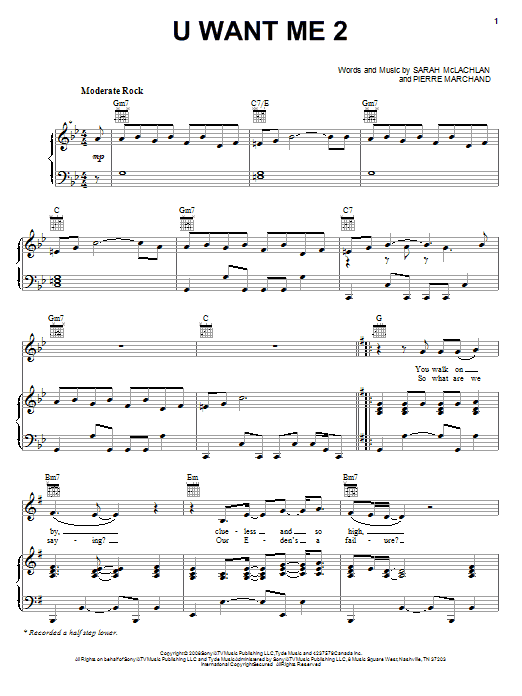 Download or print Sarah McLachlan U Want Me 2 sheet music, chords and digital score arranged for Piano, Vocal & Guitar Chords (Right-Hand Melody). This Pop score includes 5 page(s).