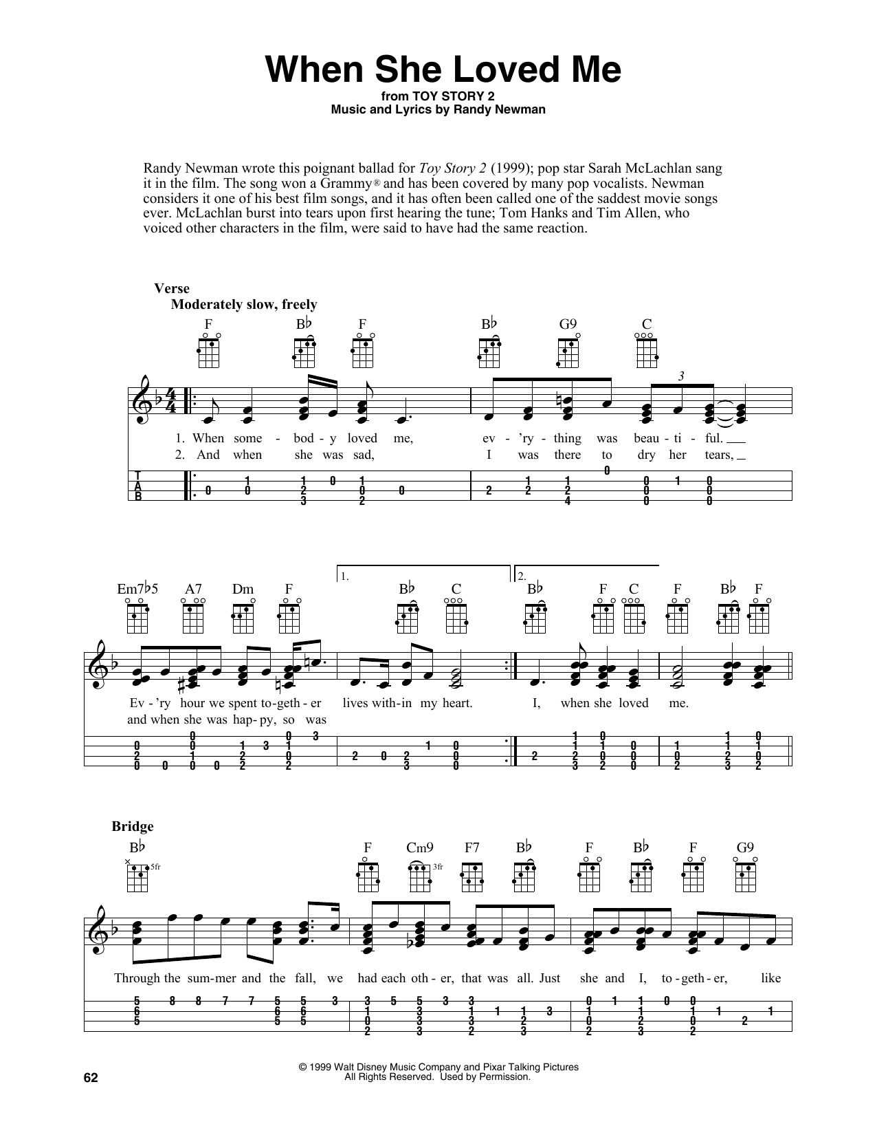 Download or print Sarah McLachlan When She Loved Me (from Toy Story 2) (arr. Fred Sokolow) sheet music, chords and digital score arranged for Easy Ukulele Tab. This Disney score includes 4 page(s).