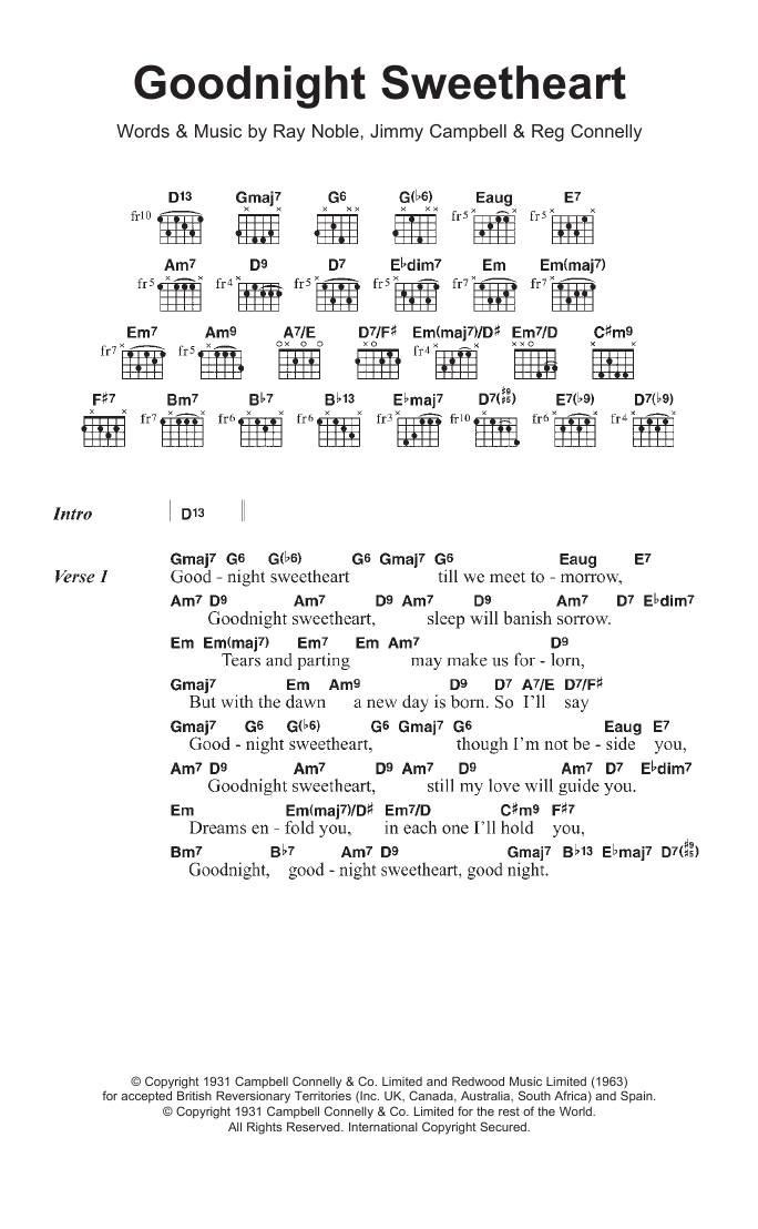 Download or print The Spaniels Goodnight Sweetheart sheet music, chords and digital score arranged for Guitar Chords/Lyrics. This Pop score includes 2 page(s).