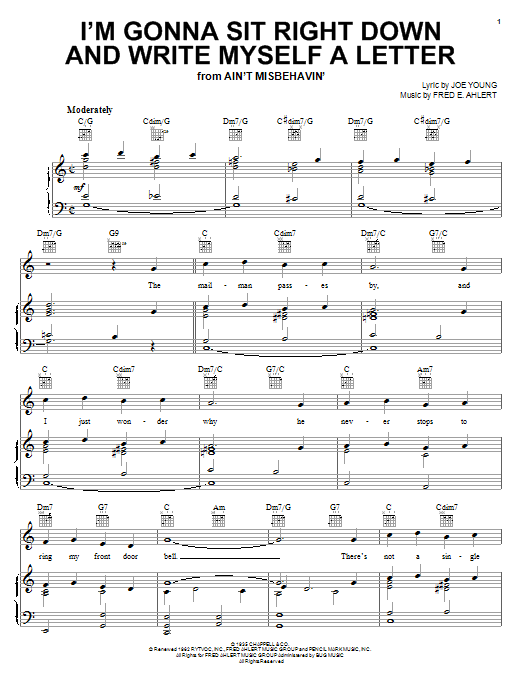Download or print Sarah Vaughan I'm Gonna Sit Right Down And Write Myself A Letter sheet music, chords and digital score arranged for Piano, Vocal & Guitar Chords (Right-Hand Melody). This Country score includes 4 page(s).