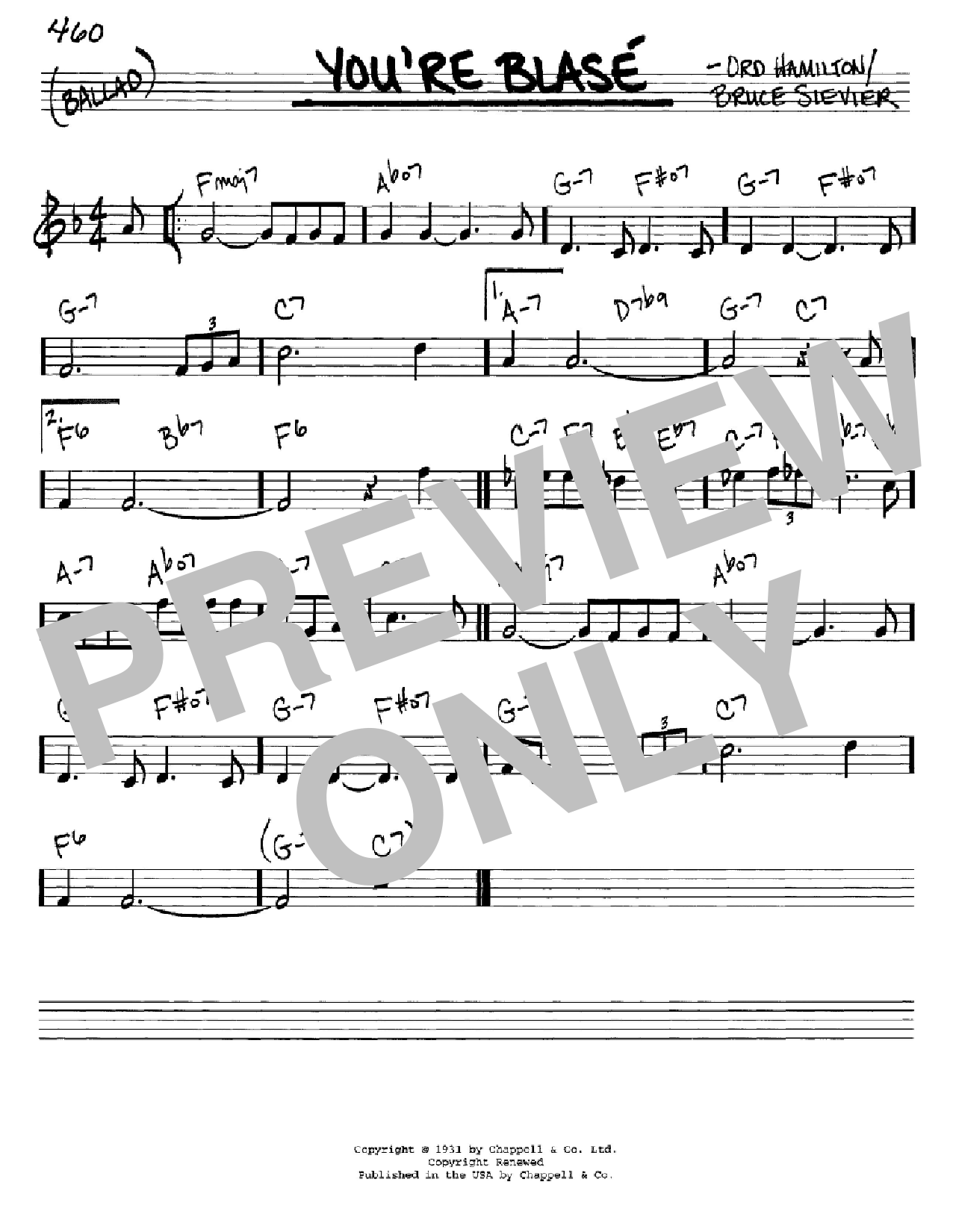 Download or print Sarah Vaughan You're Blase sheet music, chords and digital score arranged for Real Book – Melody & Chords – C Instruments. This Jazz score includes 1 page(s).