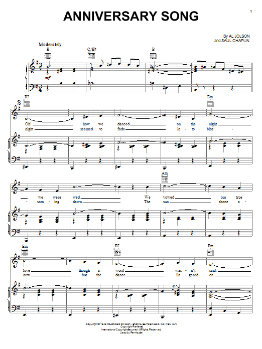 Download or print Al Jolson Anniversary Song sheet music, chords and digital score arranged for Piano Solo. This Jazz score includes 4 page(s).