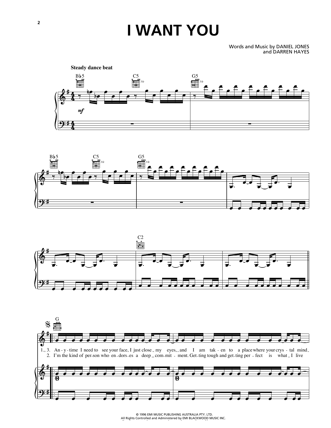 Download or print Savage Garden I Want You sheet music, chords and digital score arranged for Piano, Vocal & Guitar Chords (Right-Hand Melody). This Pop score includes 7 page(s).