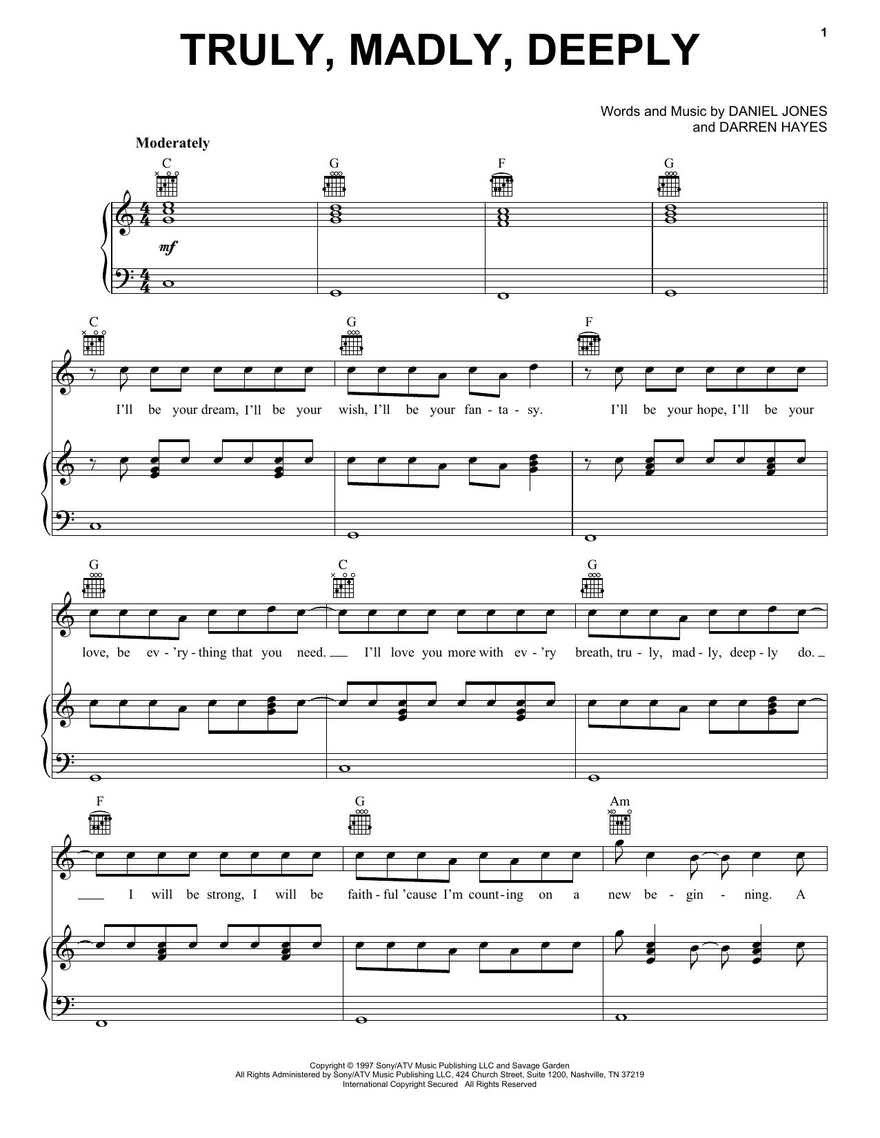 Download or print Savage Garden Truly, Madly, Deeply sheet music, chords and digital score arranged for Easy Piano. This Pop score includes 5 page(s).