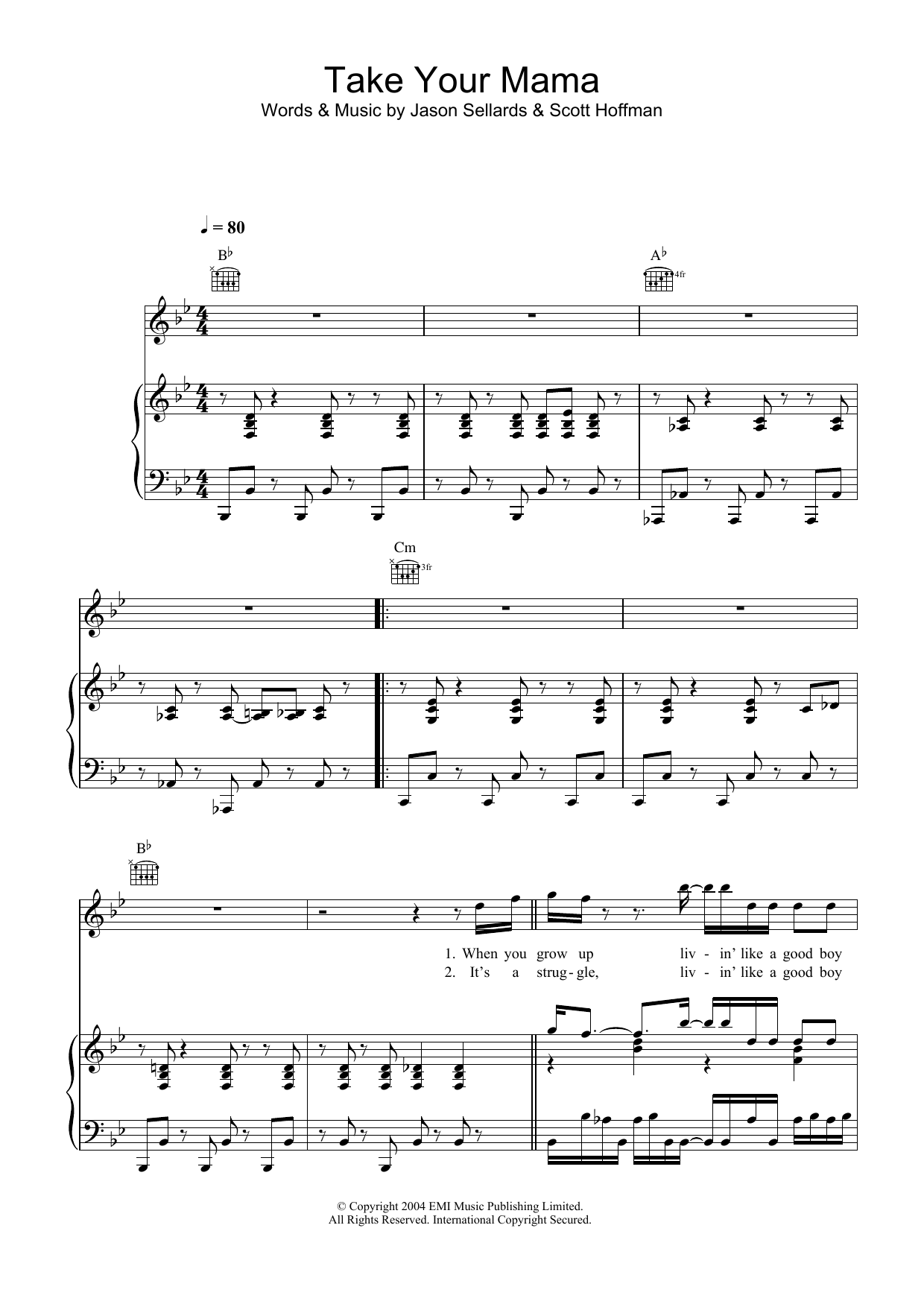 Download or print Scissor Sisters Take Your Mama sheet music, chords and digital score arranged for Piano, Vocal & Guitar Chords. This Disco score includes 8 page(s).