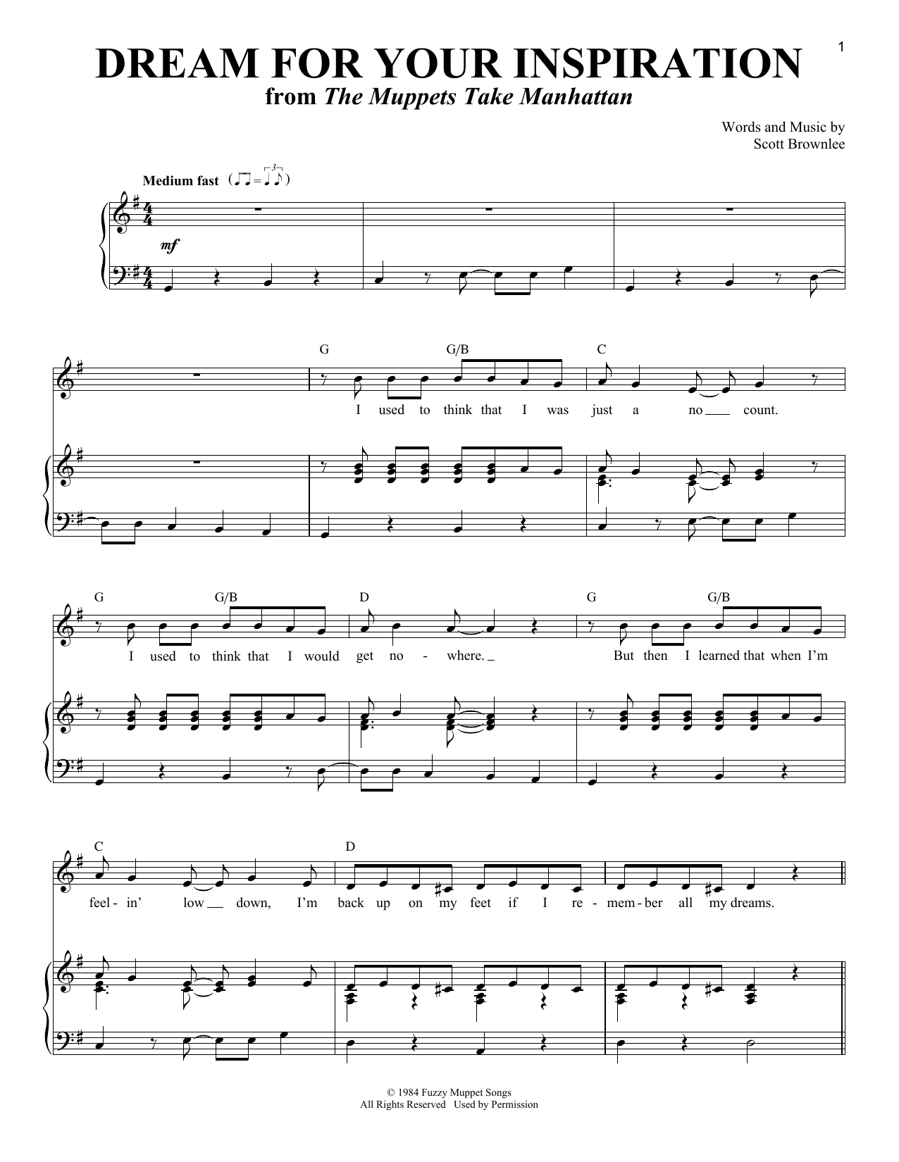 Download or print Scott Brownlee Dream For Your Inspiration sheet music, chords and digital score arranged for Piano & Vocal. This Children score includes 5 page(s).