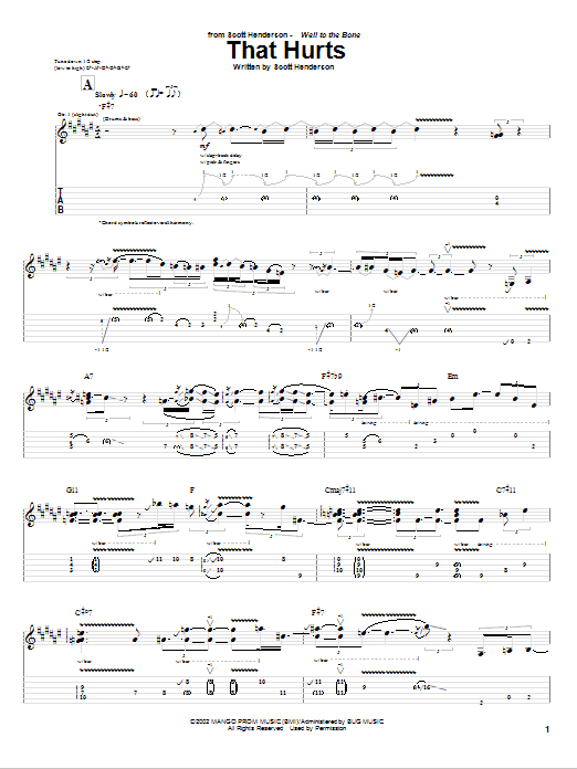 Download or print Scott Henderson That Hurts sheet music, chords and digital score arranged for Guitar Tab. This Blues score includes 11 page(s).