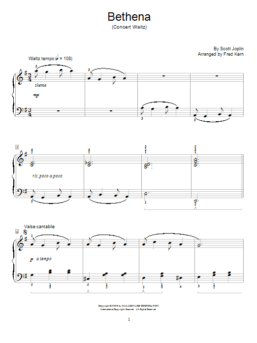 Download or print Scott Joplin Bethena, Ragtime Waltz sheet music, chords and digital score arranged for Educational Piano. This Jazz score includes 6 page(s).