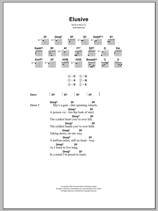 Download or print Scott Matthews Elusive sheet music, chords and digital score arranged for Guitar Chords/Lyrics. This Rock score includes 3 page(s).