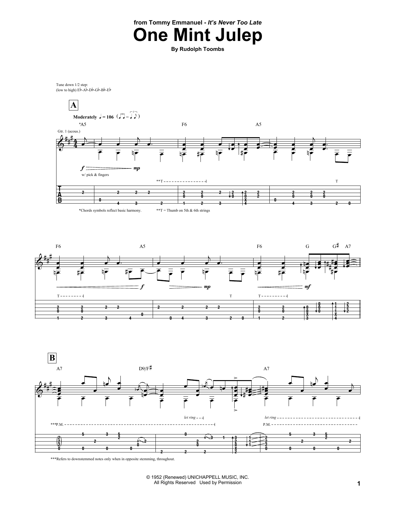 Download or print Tommy Emmanuel One Mint Julep sheet music, chords and digital score arranged for Guitar Tab. This Standards score includes 9 page(s).