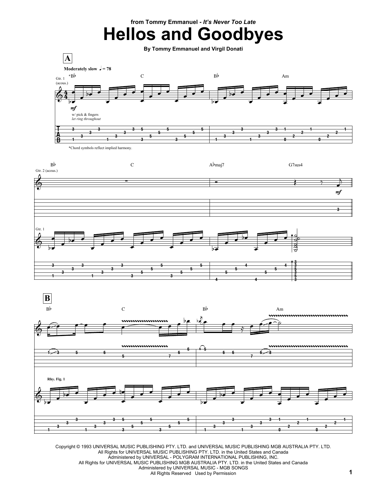 Download or print Tommy Emmanuel Hellos And Goodbyes sheet music, chords and digital score arranged for Guitar Tab. This Jazz score includes 11 page(s).