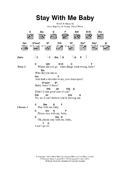 Download or print Scott Walker Stay With Me Baby sheet music, chords and digital score arranged for Guitar Chords/Lyrics. This Soul score includes 2 page(s).