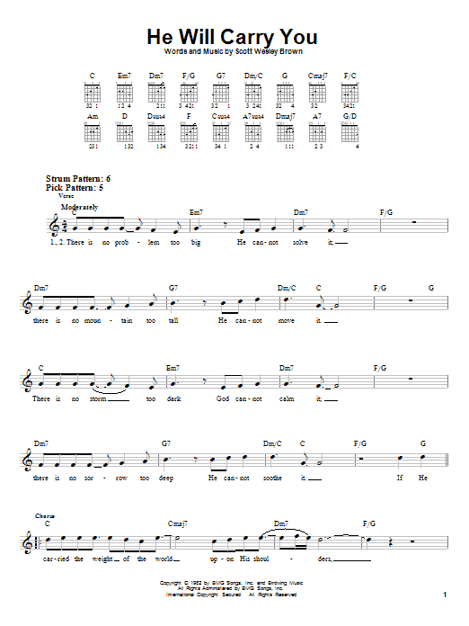 Download or print Scott Wesley Brown He Will Carry You sheet music, chords and digital score arranged for Piano, Vocal & Guitar Chords (Right-Hand Melody). This Christian score includes 5 page(s).
