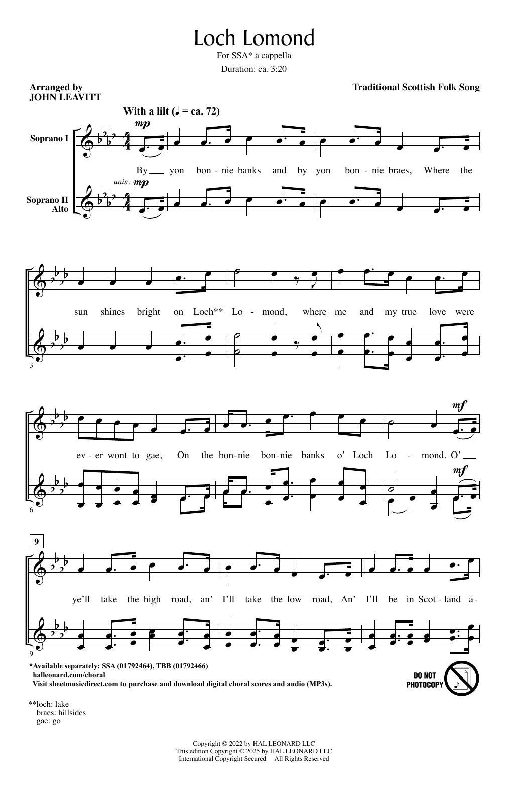 Download or print Scottish Folk Song Loch Lomond (arr. John Leavitt) sheet music, chords and digital score arranged for SSA Choir. This Folk score includes 4 page(s).