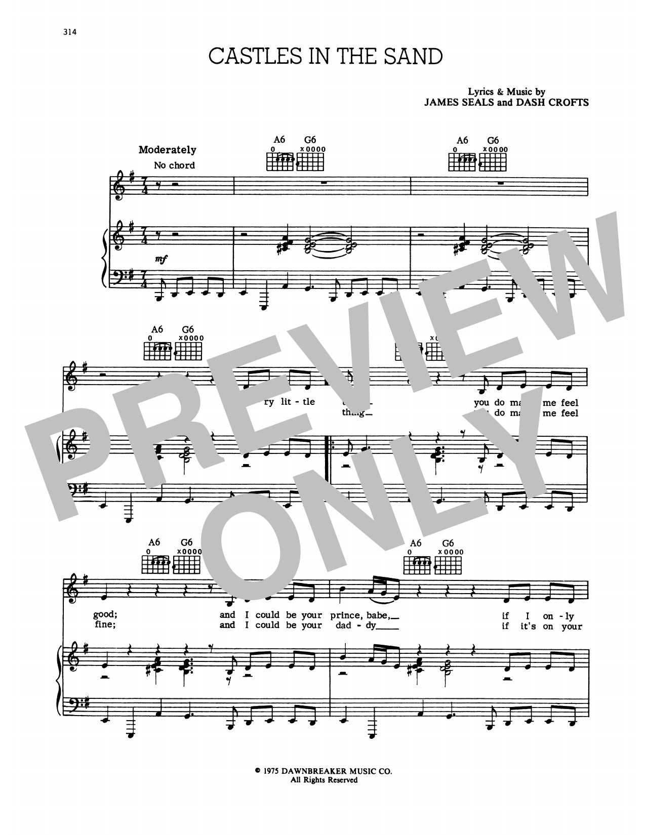 Download or print Seals and Crofts Castles In The Sand sheet music, chords and digital score arranged for Piano & Vocal. This Pop score includes 1 page(s).