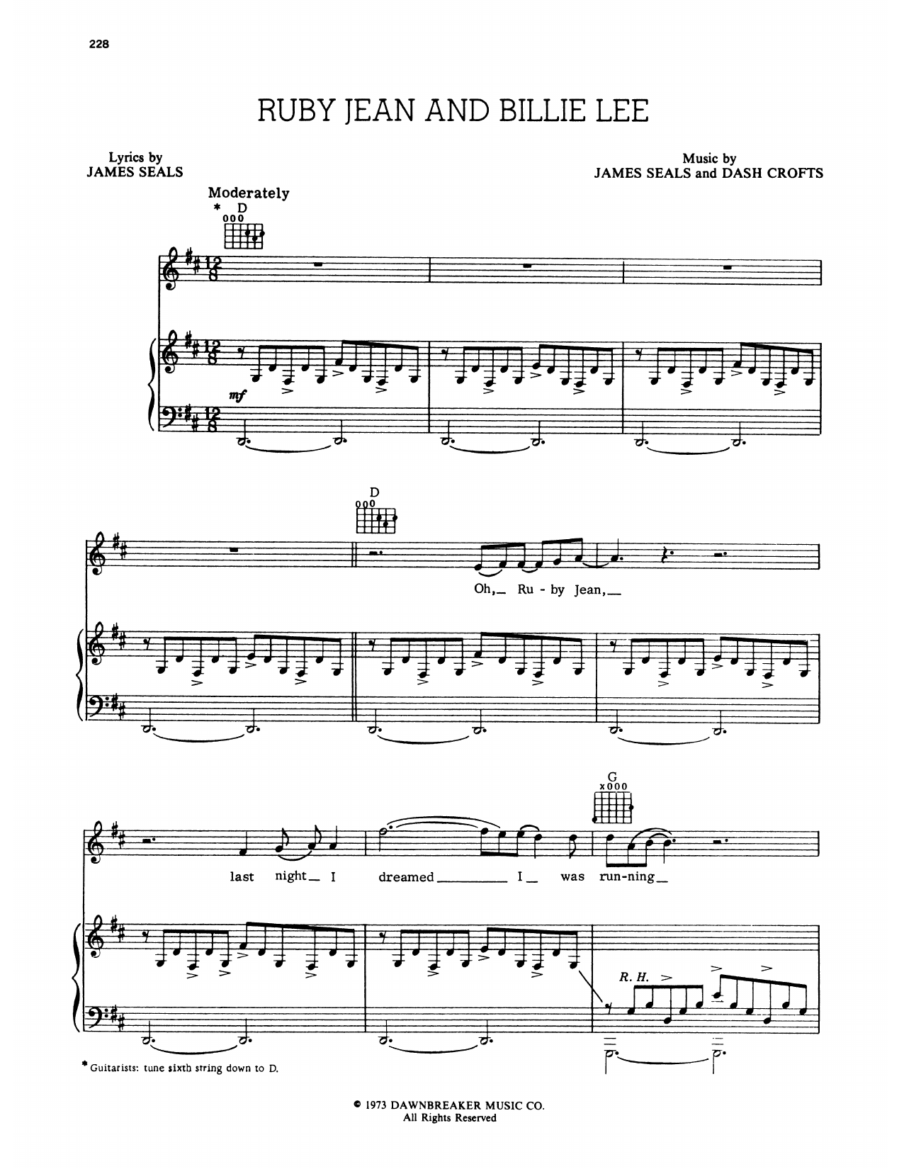 Download or print Seals and Crofts Ruby Jean And Billie Lee sheet music, chords and digital score arranged for Piano & Vocal. This Pop score includes 11 page(s).