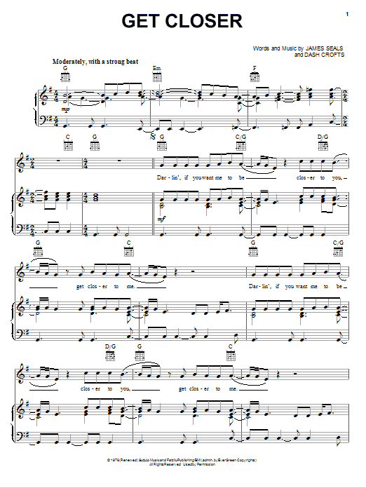 Download or print Seals & Crofts Get Closer sheet music, chords and digital score arranged for Piano, Vocal & Guitar Chords (Right-Hand Melody). This Pop score includes 4 page(s).
